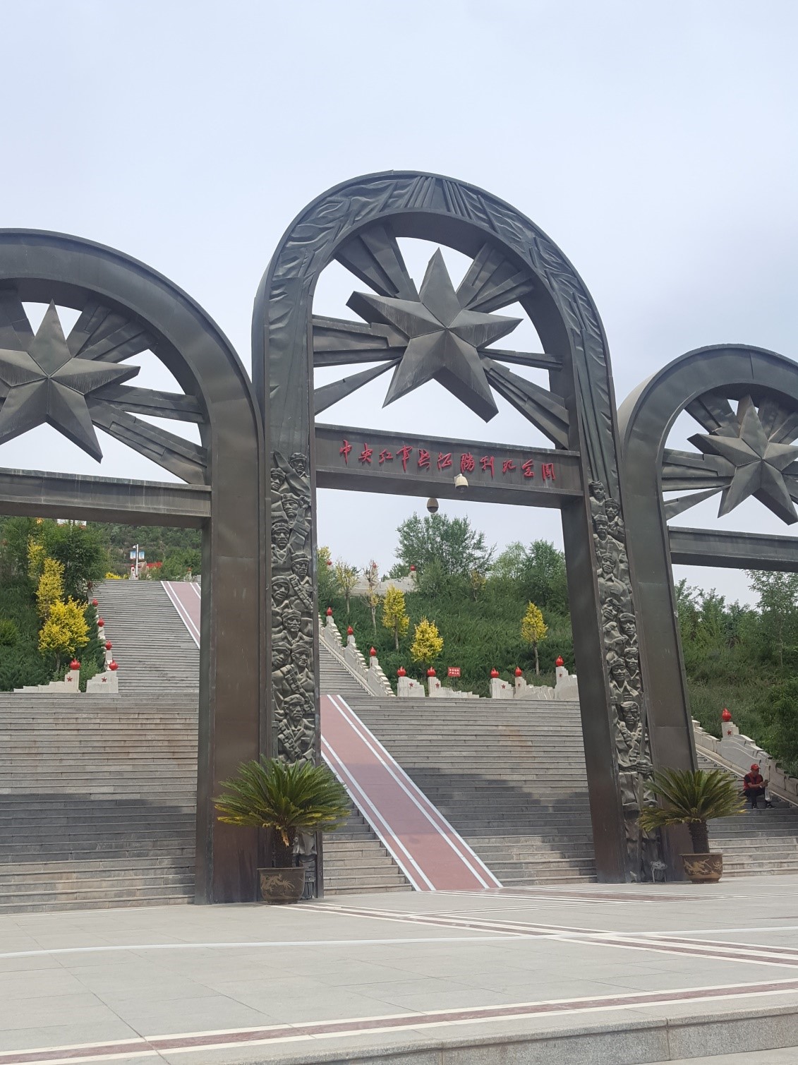 顺着门楼后的阶梯向上走,在台阶中间的红色石面上,记录着红军长征的日志,反映了长征中的重要事件和主要会议等内容。上一段台阶就会有一块小广场,在广场和石阶的两边,还有许多红色的火炬。在小广场的里面有大型石塑像,有反映红军转移转斩离开老区时军民分别、依依不舍的情景的;有反映红军翻越皑皑雪山、过茫茫草地艰苦场面的。特别是两幅反映中央红军与陕北红军胜利会师的塑像,画面里有两方红军紧紧握手,欢呼胜利的场面。看到宣传手册上说这一路的台阶共有250个,寓意红军2万5千里长征的路程。