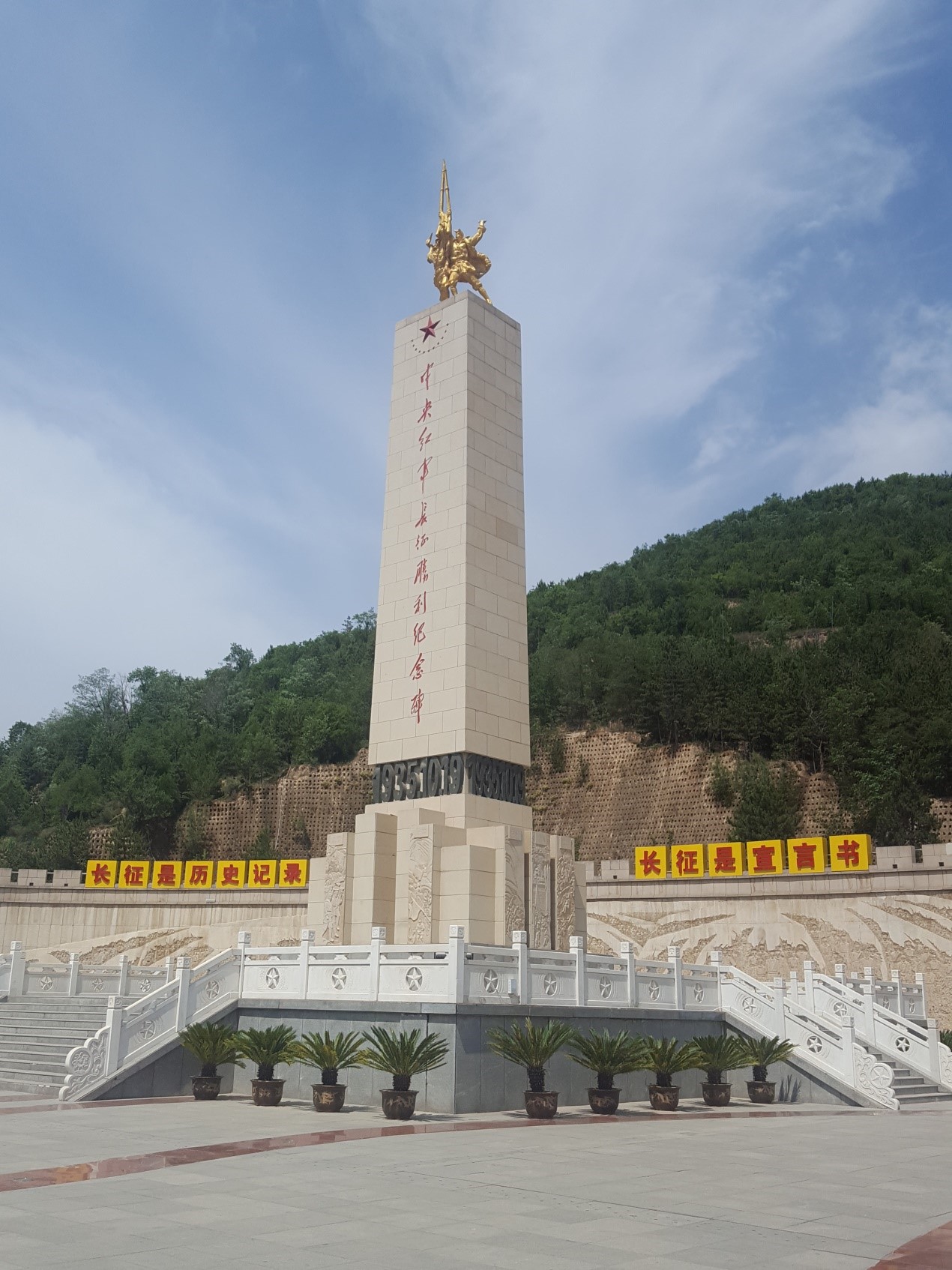 上到台阶的尽头,就来到了一个半山腰的大广场,广场中间矗立着一座大石碑,石碑上刻着“中央红军长征胜利纪念碑”几个大字。据介绍碑高为19.35米,寓意为1935年;碑底直径为10.19米,寓意为10月19日;碑座有7个台阶,代表长征胜利70周年;碑顶设有中央红军与陕北红军会师的头像,寓意中央红军与陕北红军会师。