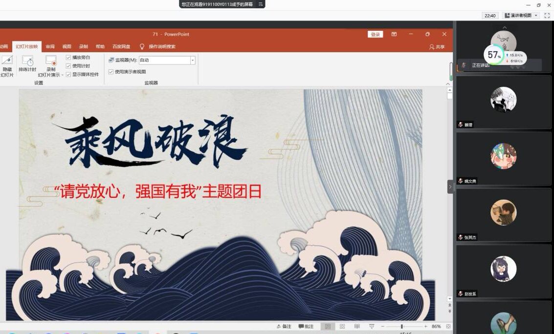 团支书成予以新民主主义革命、社会主义革命和建设、改革开放、中国特色社会主义新时代以及习近平总书记“七一”重要讲话精神五个专题来展开此次活动。然后,他又带领我们一起重温了我们党的百年奋斗历程中所取得的辉煌成就,总结了党奋斗中的宝贵经验和精神,帮助我们认清历史方位,