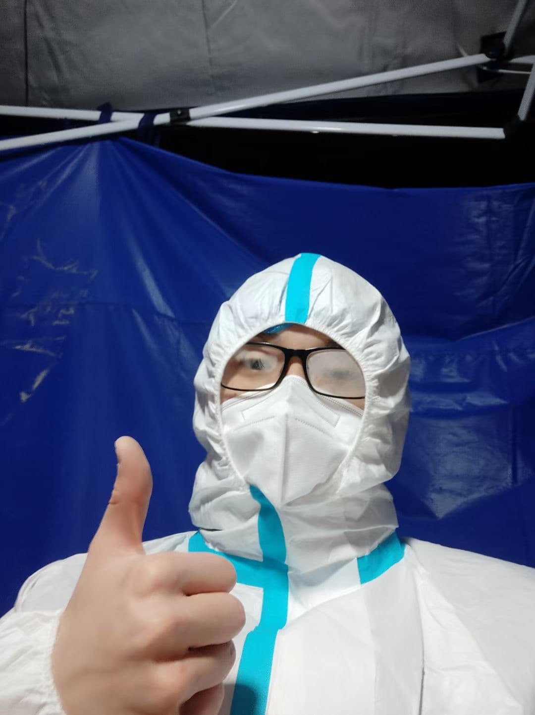 志愿者的工作并不复杂,只需要按照规定的流程,将人们的身份信息录入系统即可。但是身着防护服,戴着手套,长时间的操作并不轻松。几个小时的操作下来,可以明显地感觉到医用口罩内已经完全湿润了,防护面罩上因为沾染了水汽也变得模糊起来。第一天的志愿工作结束时,我摘下防护面罩,脱掉手套,如释重负。