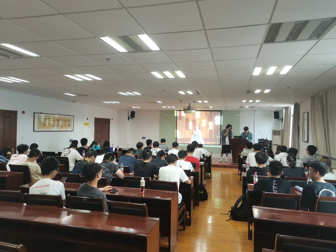 电气2班同学们在下午2时,在院办准时集合。班干部贴心地为每位同学准备了矿泉水,还为同学们邀请了学长来指导。合唱训练在学长和刘子桢的指导下和钱成卓同学的指挥下顺利进行。